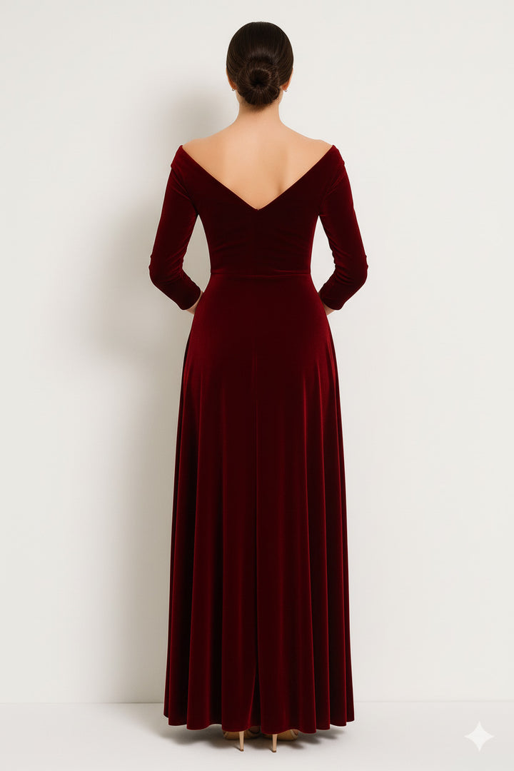 Abito in Velluto elastico. Scollo omerale con manica aderente con lunghezza 3/4. Gonna ampia con spacco. L'abito non presenta zip. Grazie all'elasticità del tessuto può essere indossato come una t-shirt e avere lo stesso comfort.