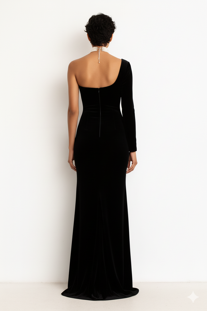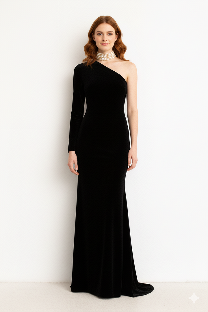 Abito in Velluto elastico. Scollo asimmetrico monospalla. Manica Aderente. Gonna che accarezza i fianchi e scende leggermente svasata a semisirena. L'abito non presenta zip. Grazie all'elasticità del tessuto può essere indossato come una t-shirt e avere lo stesso comfort.