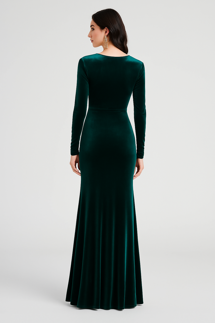 Abito in Velluto elastico. Scollo squadrato. Gonna dalla linea svasata che accarezza i finchi con spacco e torcion in vita. L'abito non presenta zip. Grazie all'elasticità del tessuto può essere indossato come una t-shirt e avere lo stesso comfort.