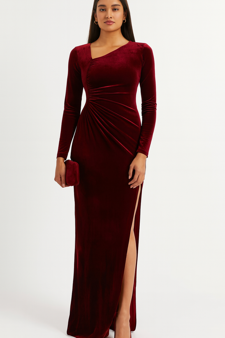 Abito in Velluto elastico. Scollo asimmetrico laterale con manica aderente. Gonna svasata che accarezza i fianchi con spacco laterale e drappeggio sul lato opposto. L'abito non presenta zip. Grazie all'elasticità del tessuto può essere indossato come una t-shirt e avere lo stesso comfort.