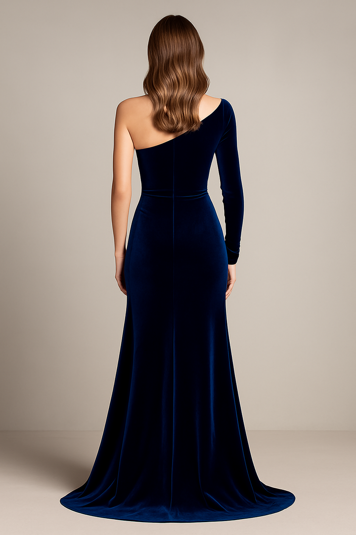Abito in Velluto elastico. Scollo asimmetrico con monospalla. Gonna semisirena con spacco e arriccio. L'abito non presenta zip. Grazie all'elasticità del tessuto può essere indossato come una t-shirt e avere lo stesso comfort.