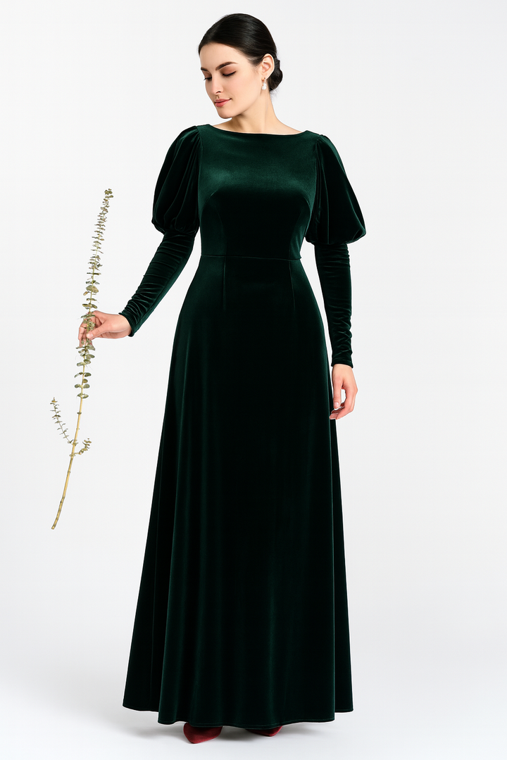 Abito in Velluto elastico. Scollo tondo a girocollo con manica a palloncino e aderente al polso. Gonna semisirena con drappeggio. Chiusura finta a portafoglio laterale e spacco. L'abito non presenta zip. Grazie all'elasticità del tessuto può essere indossato come una t-shirt e avere lo stesso comfort.