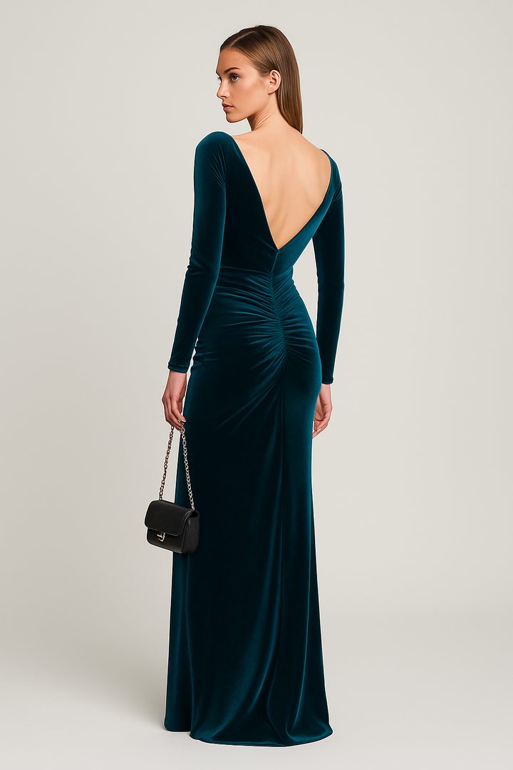 Abito in Velluto elastico dalla linea a semisirena. Girocollo con manica aderente e spallina. Scollatura nel dietro con arriccio sul lato B. L'abito non presenta zip. Grazie all'elasticità del tessuto può essere indossato come una t-shirt e avere lo stesso comfort.