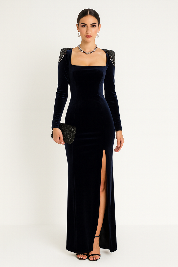 Abito in morbido e caldo velluto dal taglio dritto con spacco sul lato sinistro.