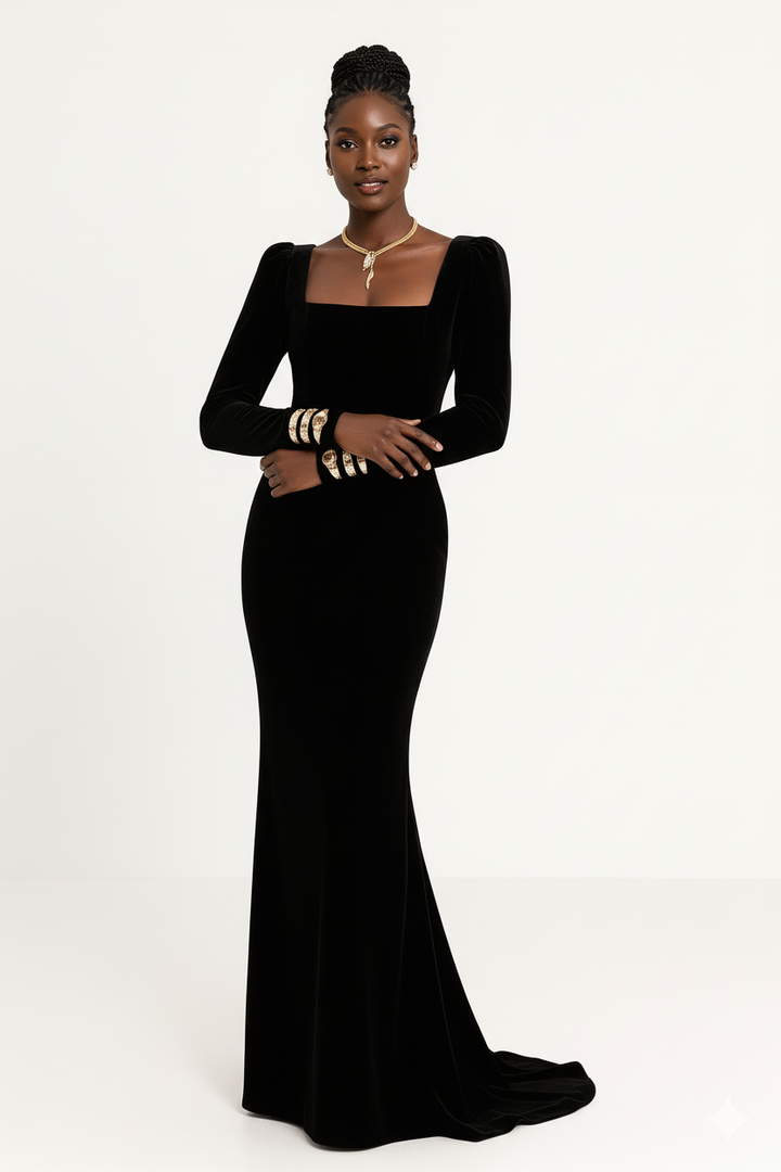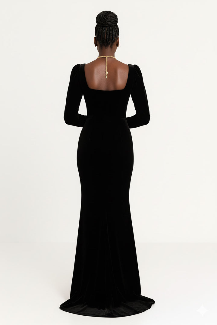Abito in Velluto elastico. Scollo quadrato con manica a sbuffo sulla spalla e aderente al polso. Gnna a sirena. L'abito non presenta zip. Grazie all'elasticità del tessuto può essere indossato come una t-shirt e avere lo stesso comfort.