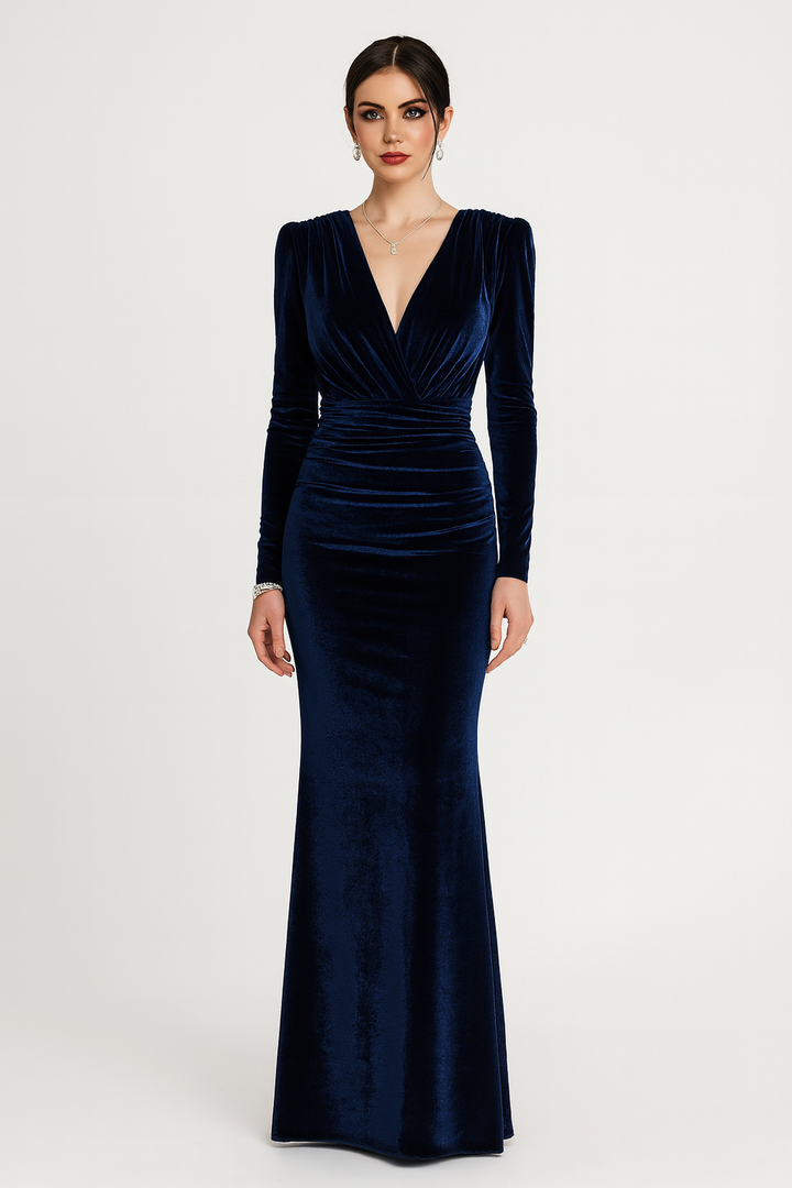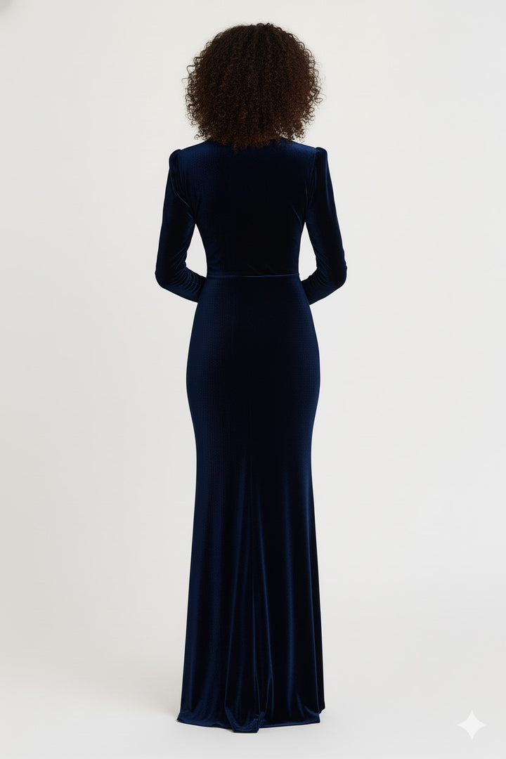 Abito in Velluto elastico. Scollo a V con maniche a sbuffo sulle spalle e aderenti al polso. Gonna che accarezza i fianchi a semisirena. L'abito non presenta zip. Grazie all'elasticità del tessuto può essere indossato come una t-shirt e avere lo stesso comfort.