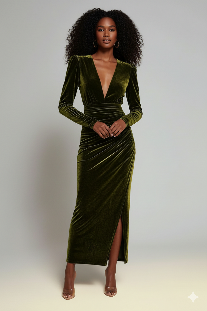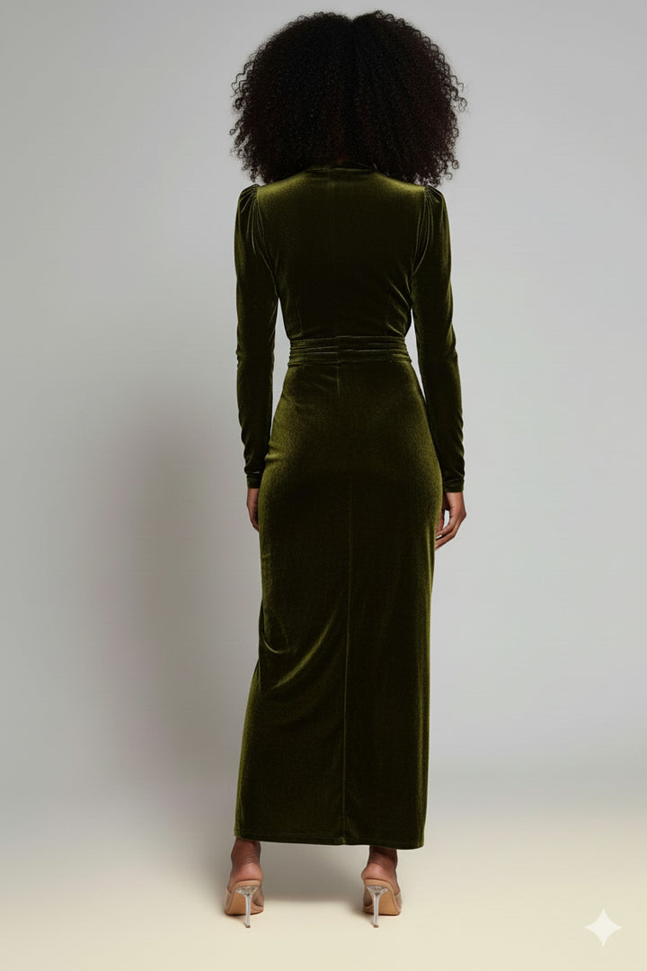 Abito in Velluto elastico. Scollo profondo a V. Manica con sbuffo sulla spalla e aderente al polso. Gonna alla caviglia dalla linea dritta. L'abito non presenta zip. Grazie all'elasticità del tessuto può essere indossato come una t-shirt e avere lo stesso comfort.