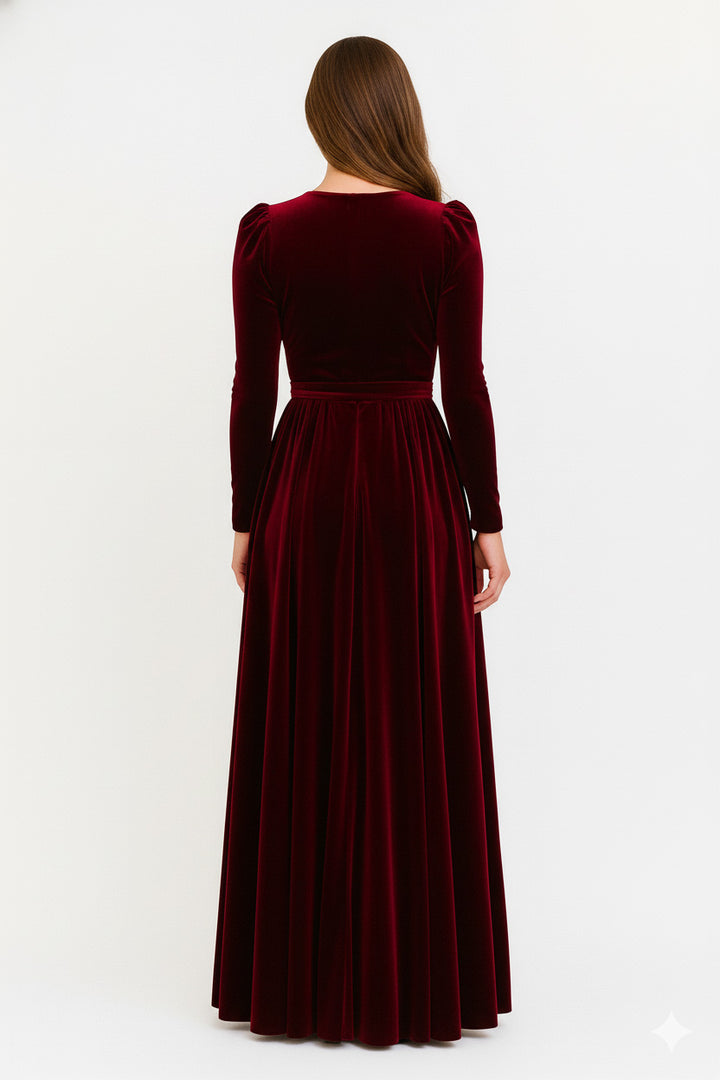 Abito in Velluto elastico. Scollo a V a portafoglio con manica a sbuffo sulla spalla e aderente al polso. Gonna morbida. Cinturino con fiocco in vita. L'abito non presenta zip. Grazie all'elasticità del tessuto può essere indossato come una t-shirt e avere lo stesso comfort.