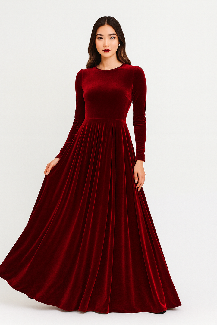 Abito in Velluto elastico. Scollo tondo a girocollo con manica aderente. Gonna morbida. Cinturino con fiocco in vita. L'abito non presenta zip. Grazie all'elasticità del tessuto può essere indossato come una t-shirt e avere lo stesso comfort.