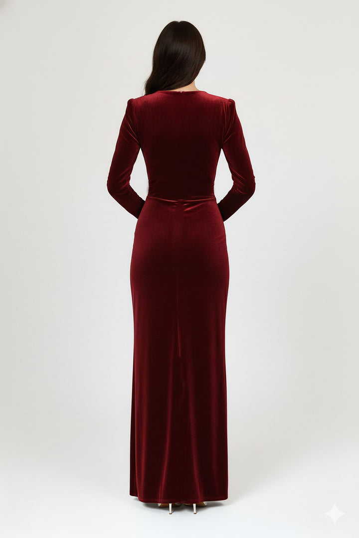 Abito in Velluto elastico. Scollo a V con maniche a sbuffo sulle spalle e aderenti al polso. Gonna che accarezza i fianchi con spacco a modo di apertura a portafoglio, con cintura drappeggiata in vita solo nel davanti.  L'abito non presenta zip. Grazie all'elasticità del tessuto può essere indossato come una t-shirt e avere lo stesso comfort.