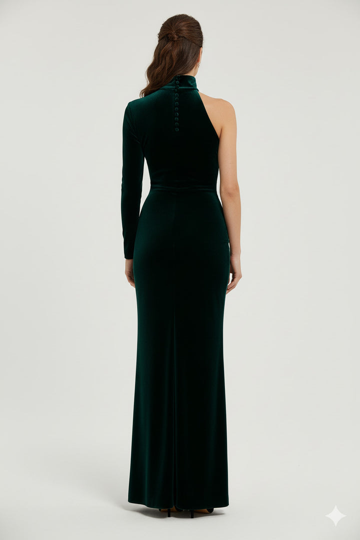 Abito in Velluto elastico. Scollo con collo alto asimmetrico a monospalla con manica aderente. Gonna che accarezza i fianchi e scende leggermente svasata con drappeggio laterale e spacco. L'abito non presenta zip. Grazie all'elasticità del tessuto può essere indossato come una t-shirt e avere lo stesso comfort. Abito con bottoncini per chiusura del collo.
