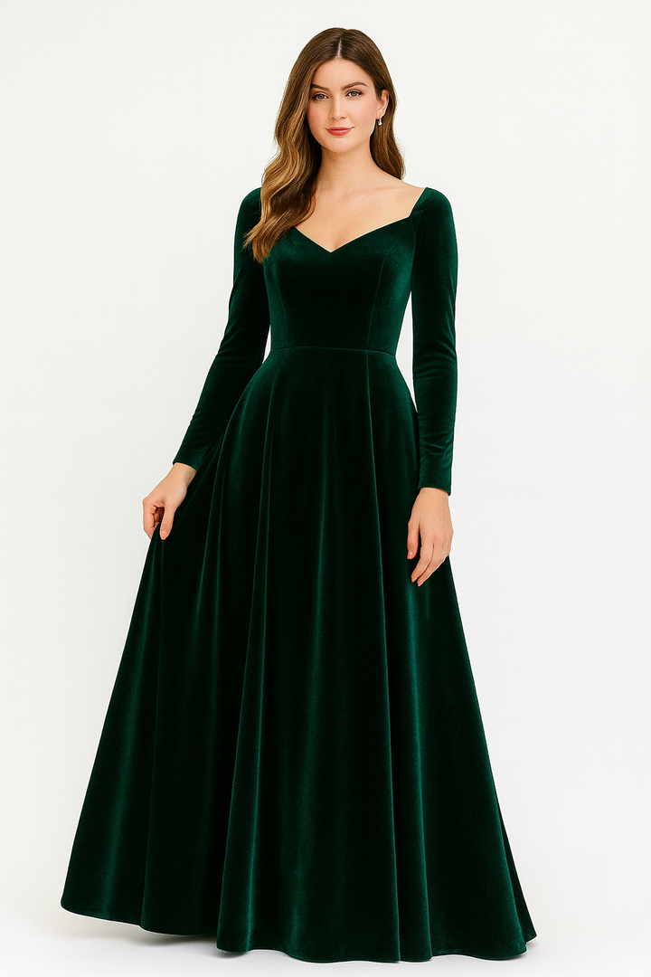Abito in Velluto elastico. Scollo a cuore con manica aderente. Gonna morbida. Cinturino con fiocco in vita. L'abito non presenta zip. Grazie all'elasticità del tessuto può essere indossato come una t-shirt e avere lo stesso comfort.