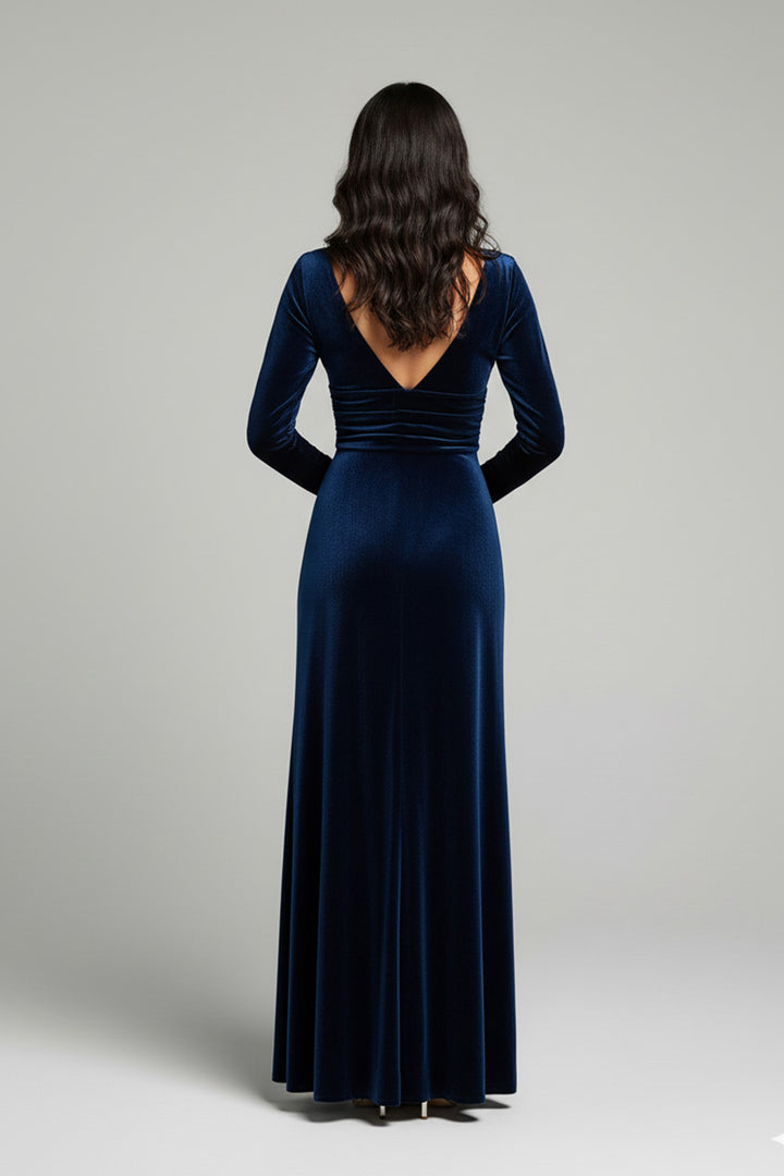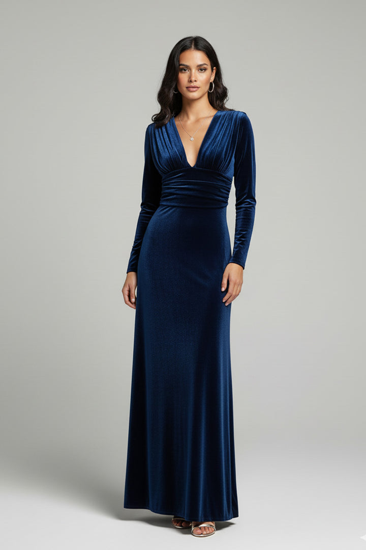 Abito in Velluto elastico. Scollo a V tutto drappeggiato.Facsia alta in vita drappeggiata. Manica aderente. Gonna dalla linea svasata. L'abito non presenta zip. Grazie all'elasticità del tessuto può essere indossato come una t-shirt e avere lo stesso comfort.