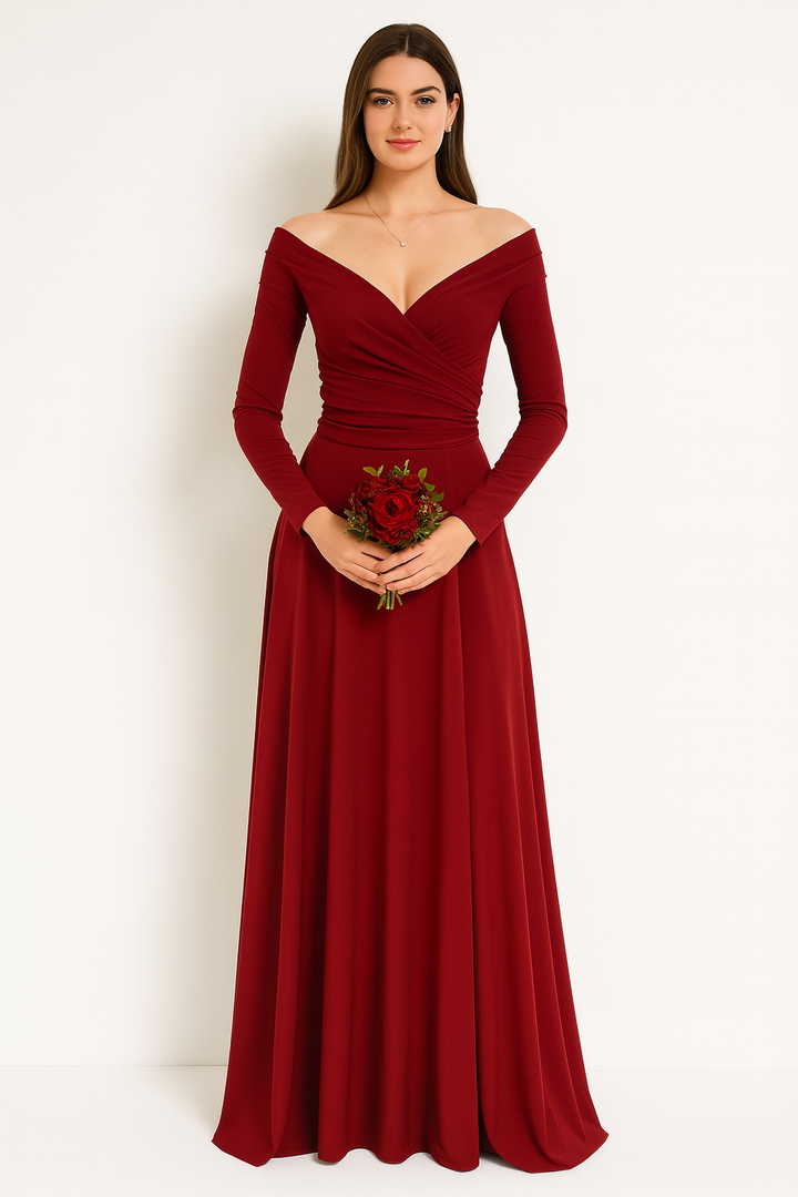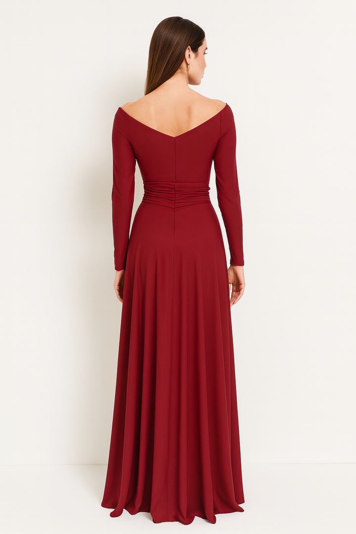Abito in tessuto elastico, lycra. Scollo omerale con manica aderente. Gonna ampia con spacco. L'abito non presenta zip. Grazie all'elasticità del tessuto può essere indossato come una t-shirt e avere lo stesso comfort.