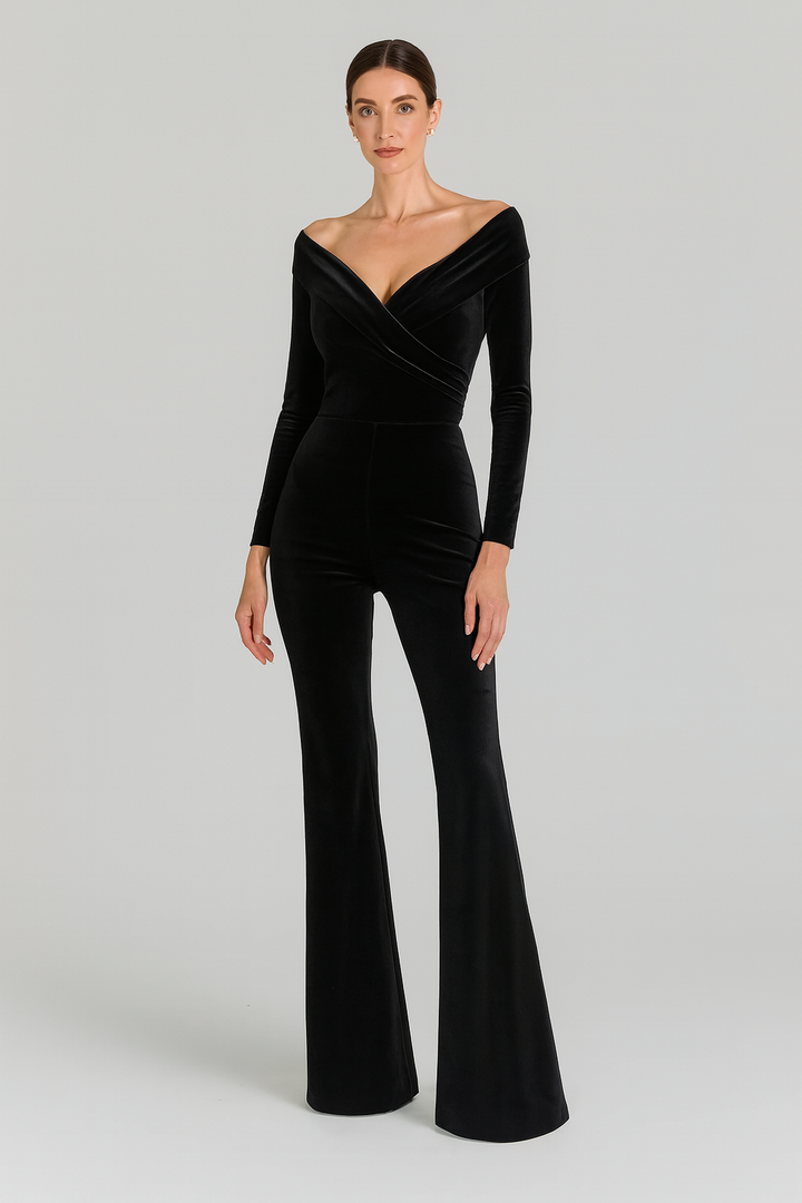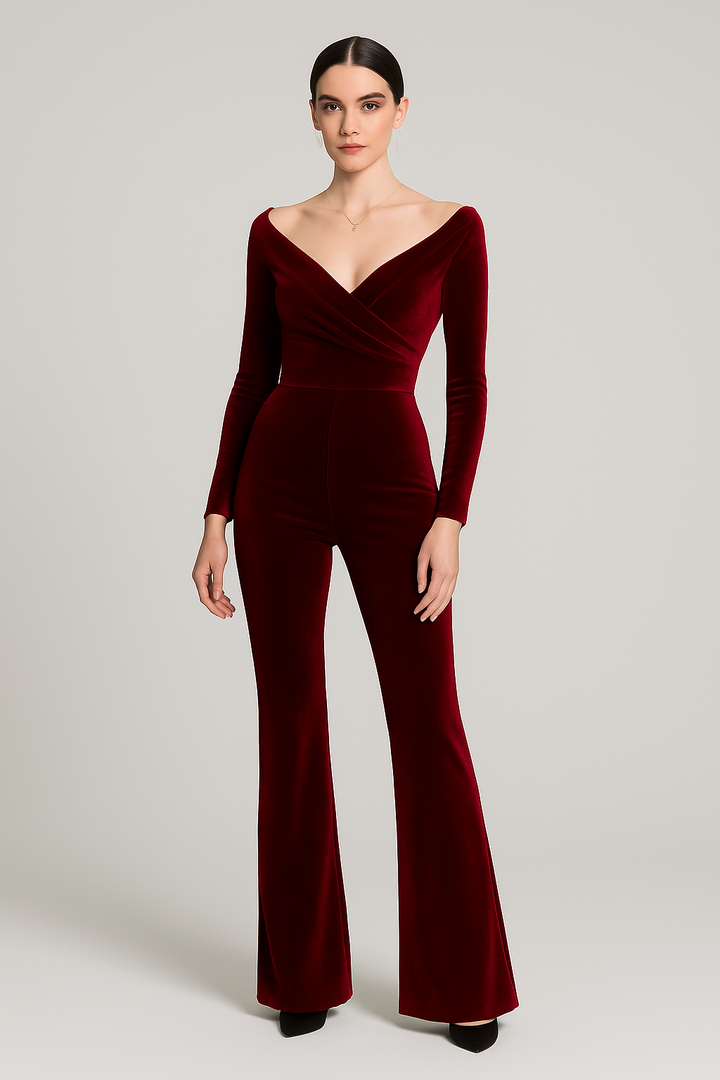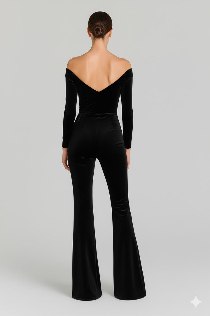 Tuta elegante in Velluto elastico. Scollo omerale con manica aderente. Pantalone a zampa di elefante. La tuta non presenta zip. Grazie all'elasticità del tessuto può essere indossato come una t-shirt e avere lo stesso comfort.