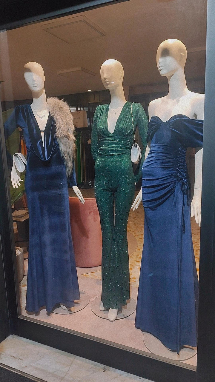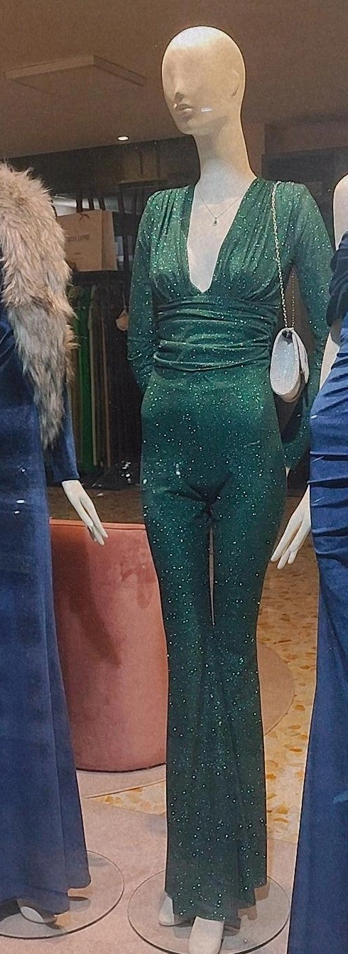 Tuta Abito in microrete elastica brillantinata interamente foderata in microfribra. Scollo a V tutto drappeggiato. Facsia alta in vita drappeggiata. Manica aderente. Pantalone a zampa. L'abito non presenta zip. Grazie all'elasticità del tessuto può essere indossato come una t-shirt e avere lo stesso comfort.