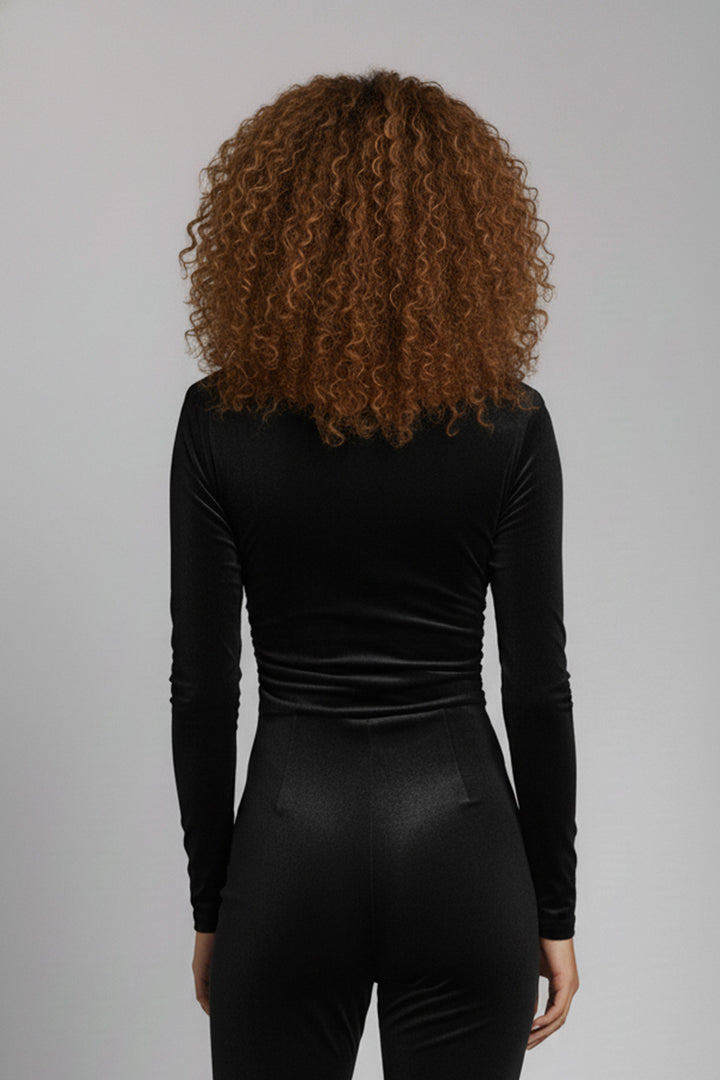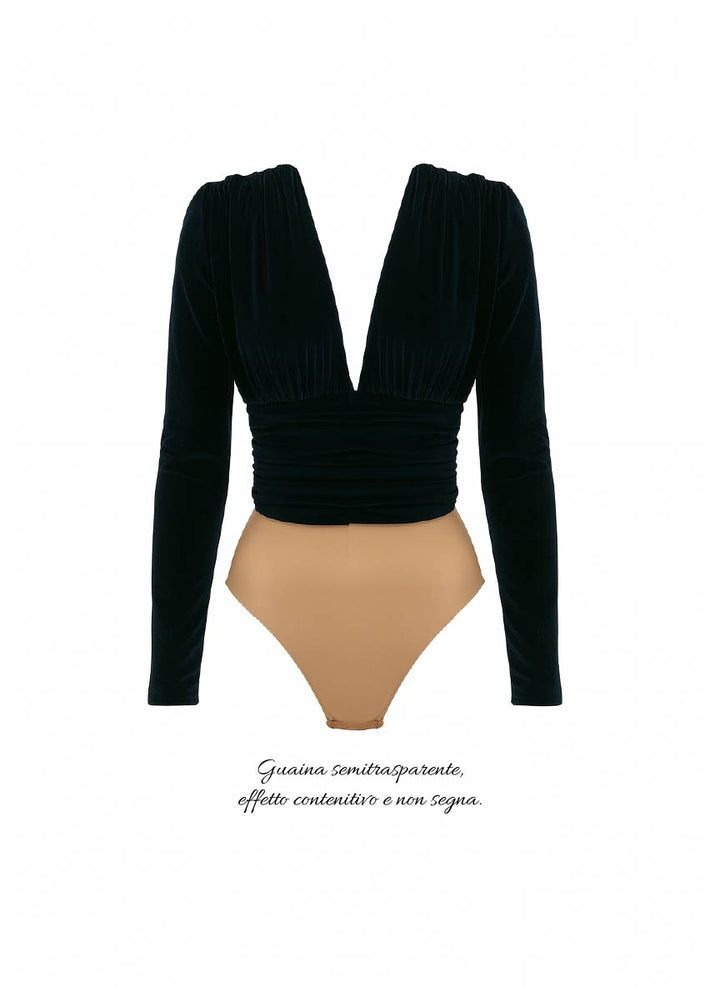Body velluto elastico. Scollo a V tutto drappeggiato. Fascia alta in vita drappeggiata. Manica  aderente. La parte inferiore dello slip è in tessuto guaina semitrasparente che contiene e non segna. Chiusura con ganci maschio/femmina. Grazie all'elasticità del tessuto può essere indossato come una t-shirt e avere lo stesso comfort.