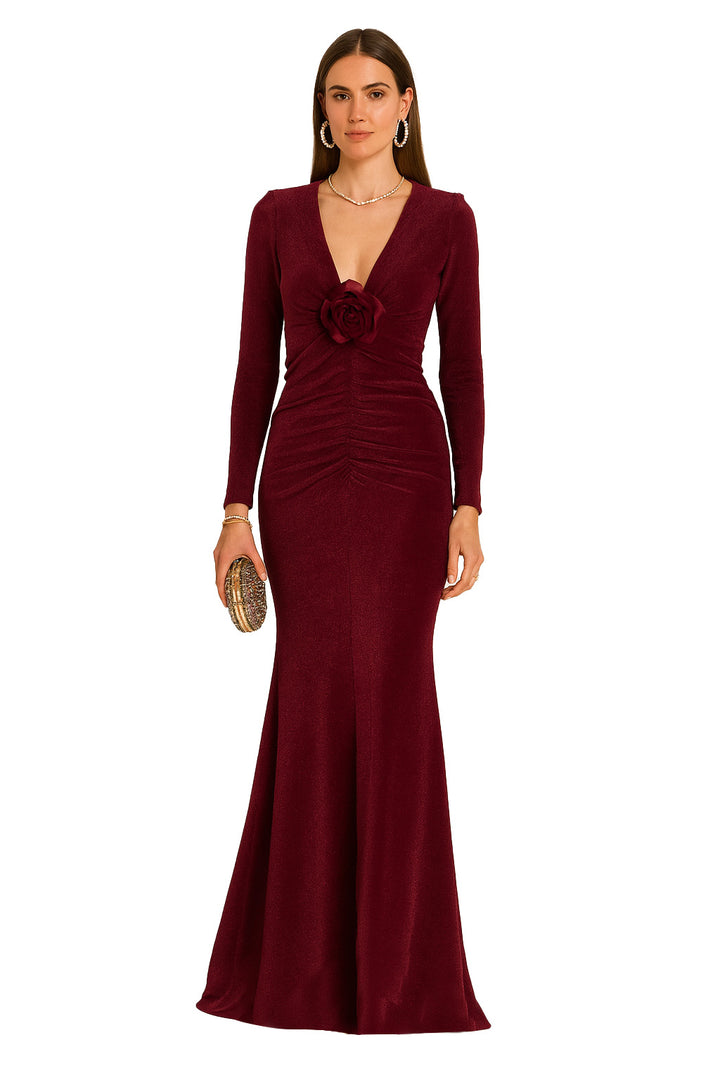 Abito semi sirena in morbida maglia lurex. Scollo a V con arricci e impreziosito da una rosa a spilla a tono. Arriccio al centro davanti per slanciare la figura e adatta a coprire qualche piccola imperfezione.