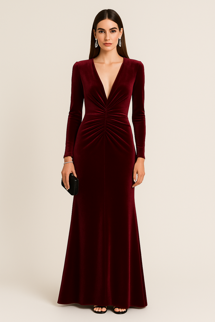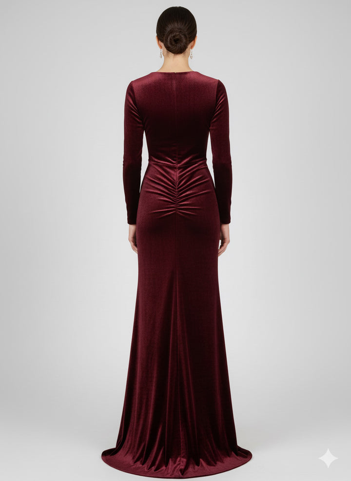 Abito semi sirena in morbido e caldo velluto. Scollo a V con arricci e impreziosito da una rosa a spilla a tono. Arriccio al centro davanti per slanciare la figura e adatta a coprire qualche piccola imperfezione.