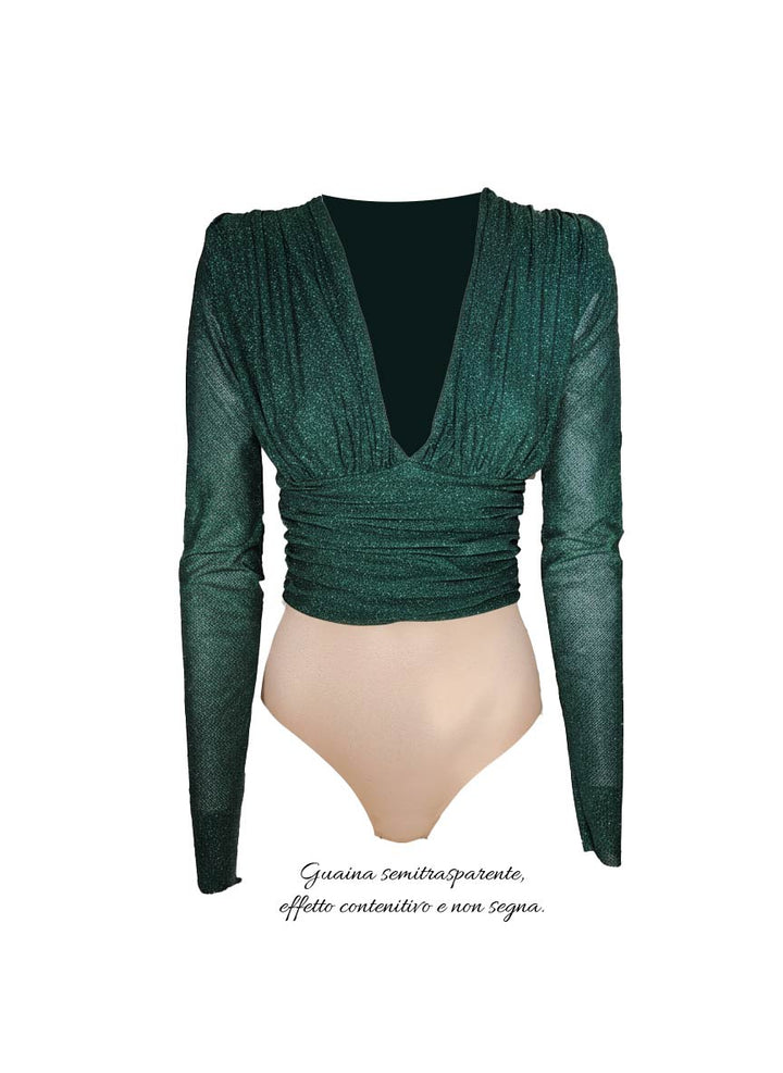 Body in microrete elastica brillantinata interamente foderata in microfribra. Scollo a V tutto drappeggiato. Facsia alta in vita drappeggiata. Manica aderente. La parte inferiore dello slip è in tessuto guaina semitrasparente che contiene e non segna. Chiusura con ganci maschio/femmina. Grazie all'elasticità del tessuto può essere indossato come una t-shirt e avere lo stesso comfort.