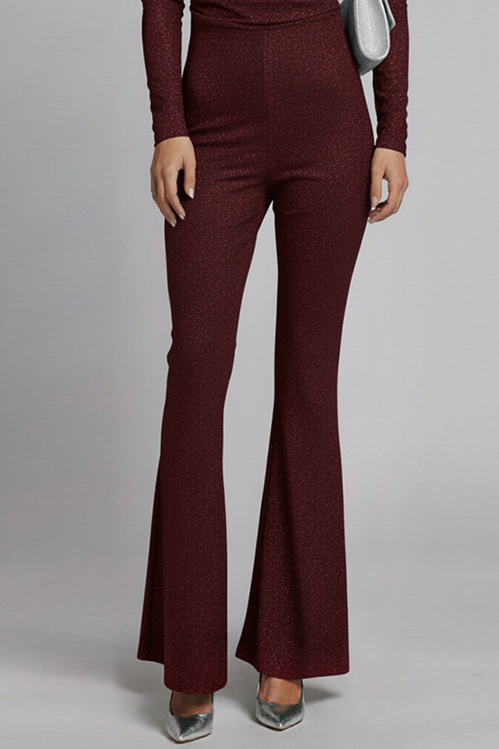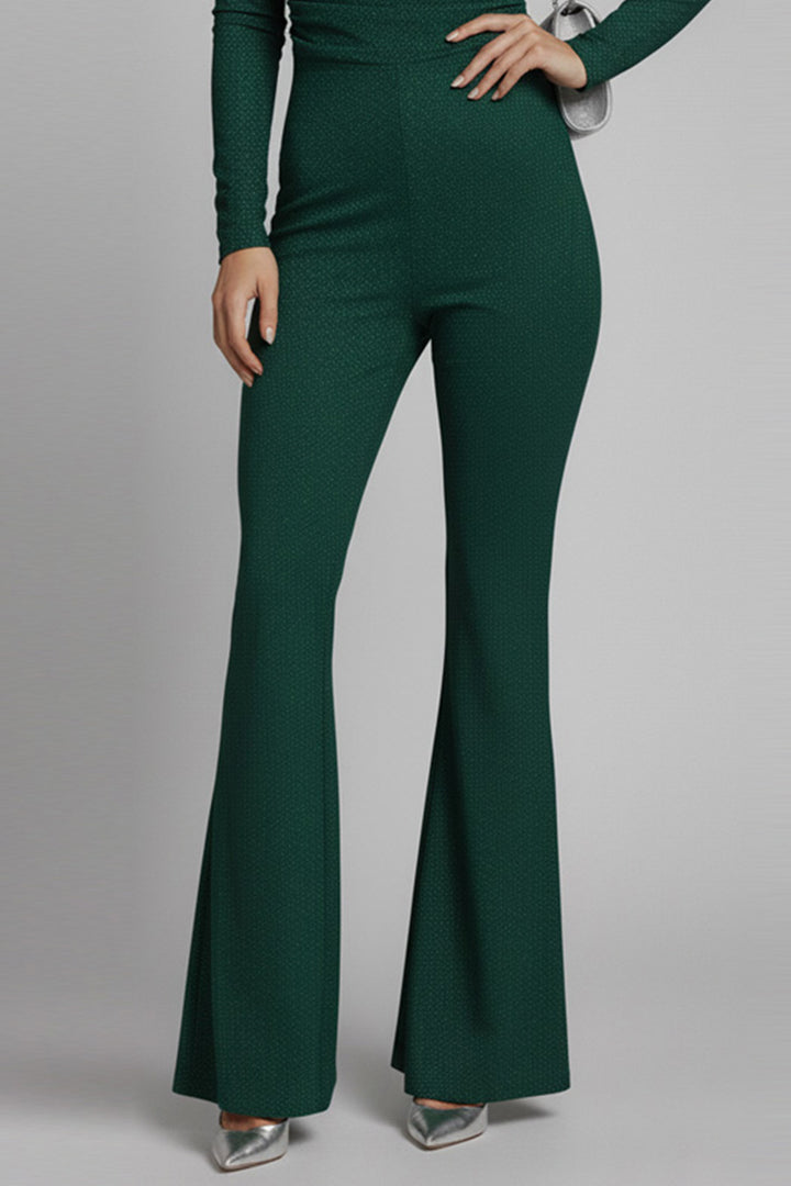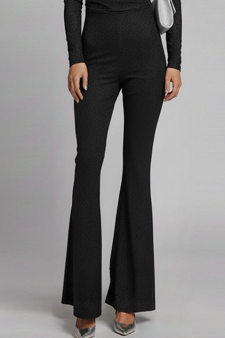 Pantalone a Zampa d'elefante in microrete elastica brillantinata interamente foderata in microfribra. Ad alta vita e porta l'elastico nascosto all'interno. Grazie all'elasticità del tessuto ha un ottimo comfort.