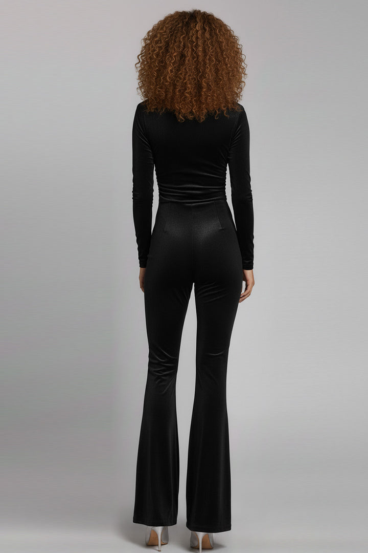 Tuta Abito in microrete elastica brillantinata interamente foderata in microfribra. Scollo a V tutto drappeggiato. Facsia alta in vita drappeggiata. Manica aderente. Pantalone a zampa. L'abito non presenta zip. Grazie all'elasticità del tessuto può essere indossato come una t-shirt e avere lo stesso comfort.